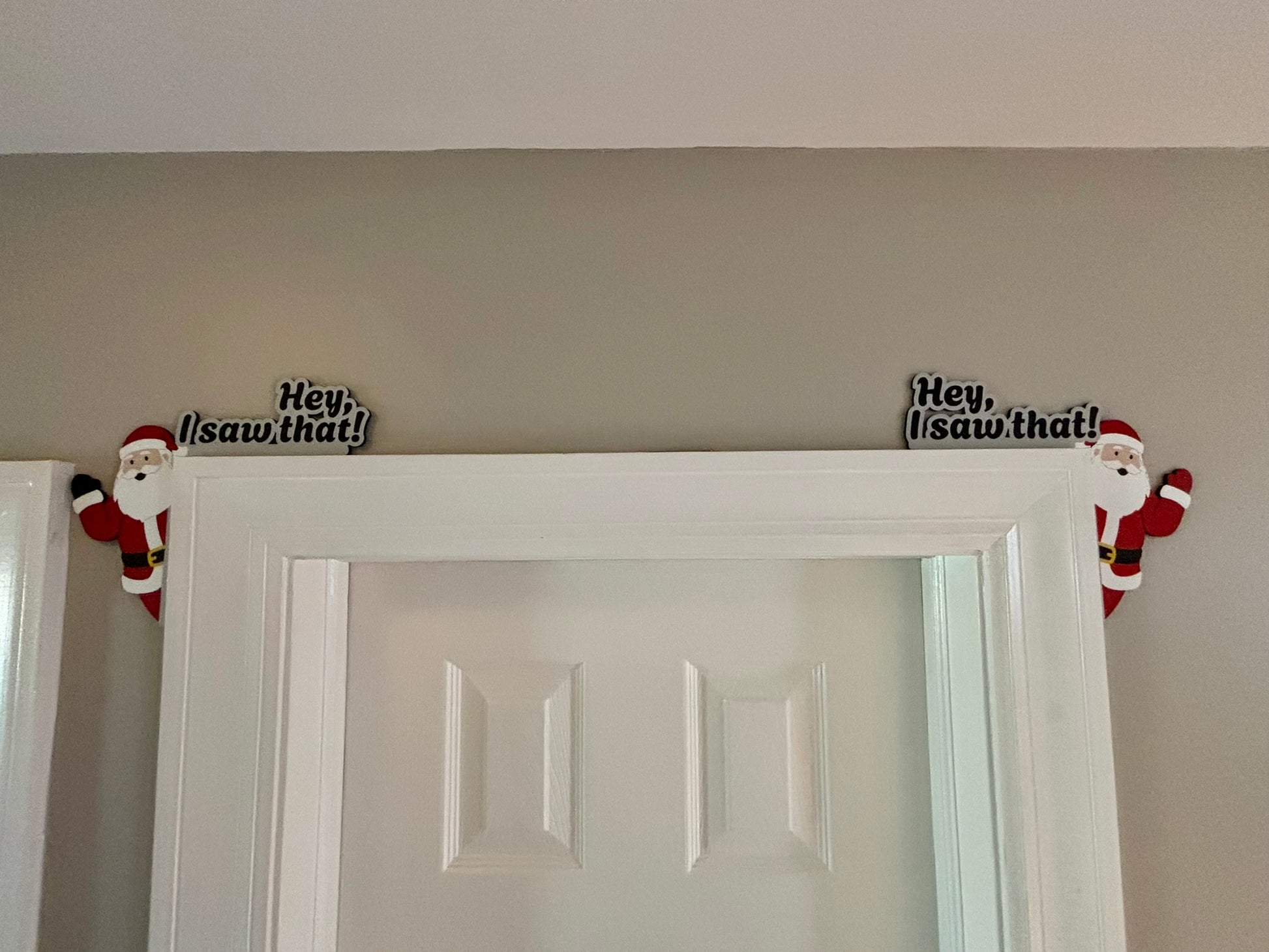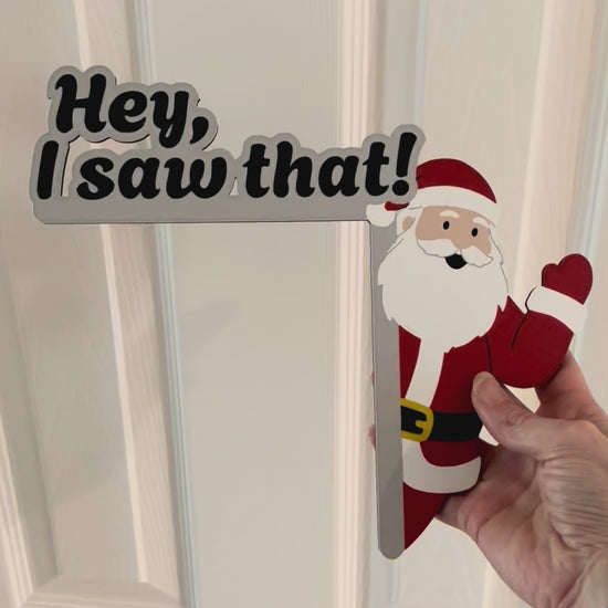 Santa is always watching! Here's a nice little reminder. You choose if you want him to rest over your right or left corner. Choose from either "Hey, I'm watching you!" or "Hey, I saw that!"